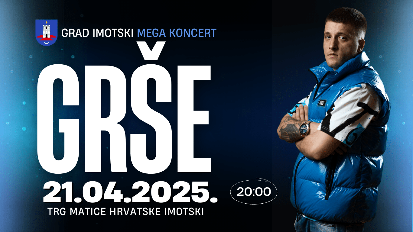Na Uskrsni ponedjeljak 21.04.2025. od 20:00 sati u organizaciji Grada Imotskog na Trgu Matice Hrvatske će nastupiti popularni triljski reper Grgo Šipek, umjetničkog imena Grše.